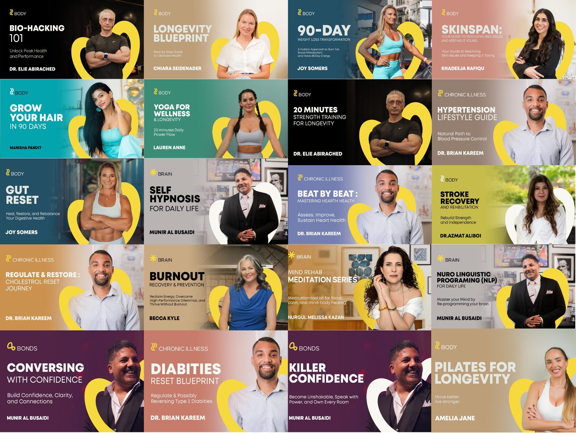 • 20+ Expert-led programs across Body (physical health), Brain (mental clarity & stress resilience), Bonds (relationships & purpose)